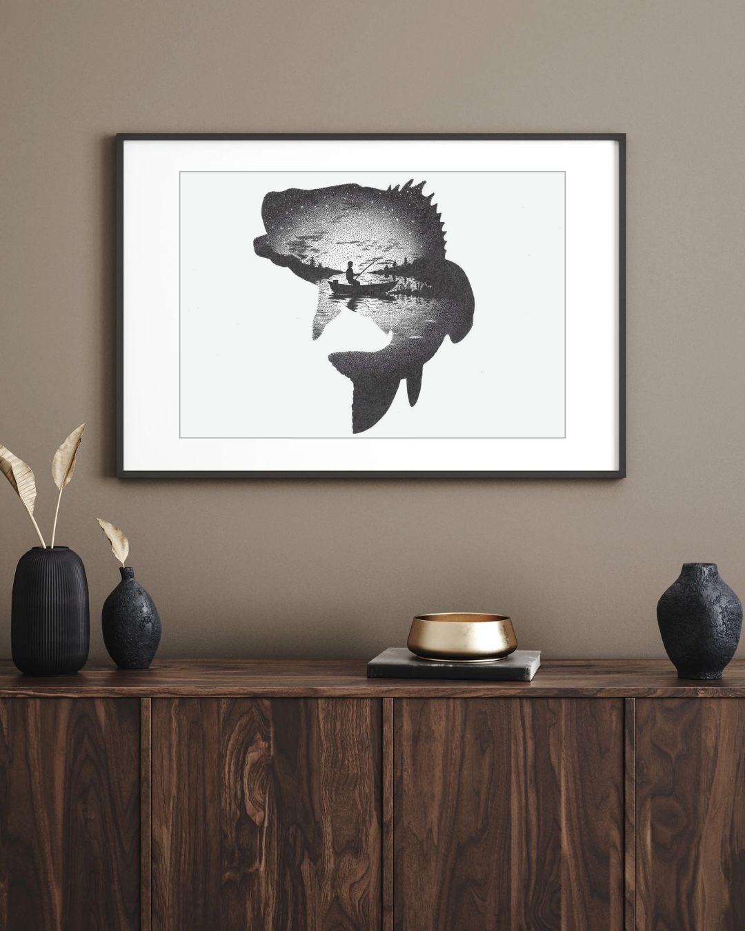 A bass silhouette with a lake scene inside featuring a bass fisherman, completed on May 22, 2024.