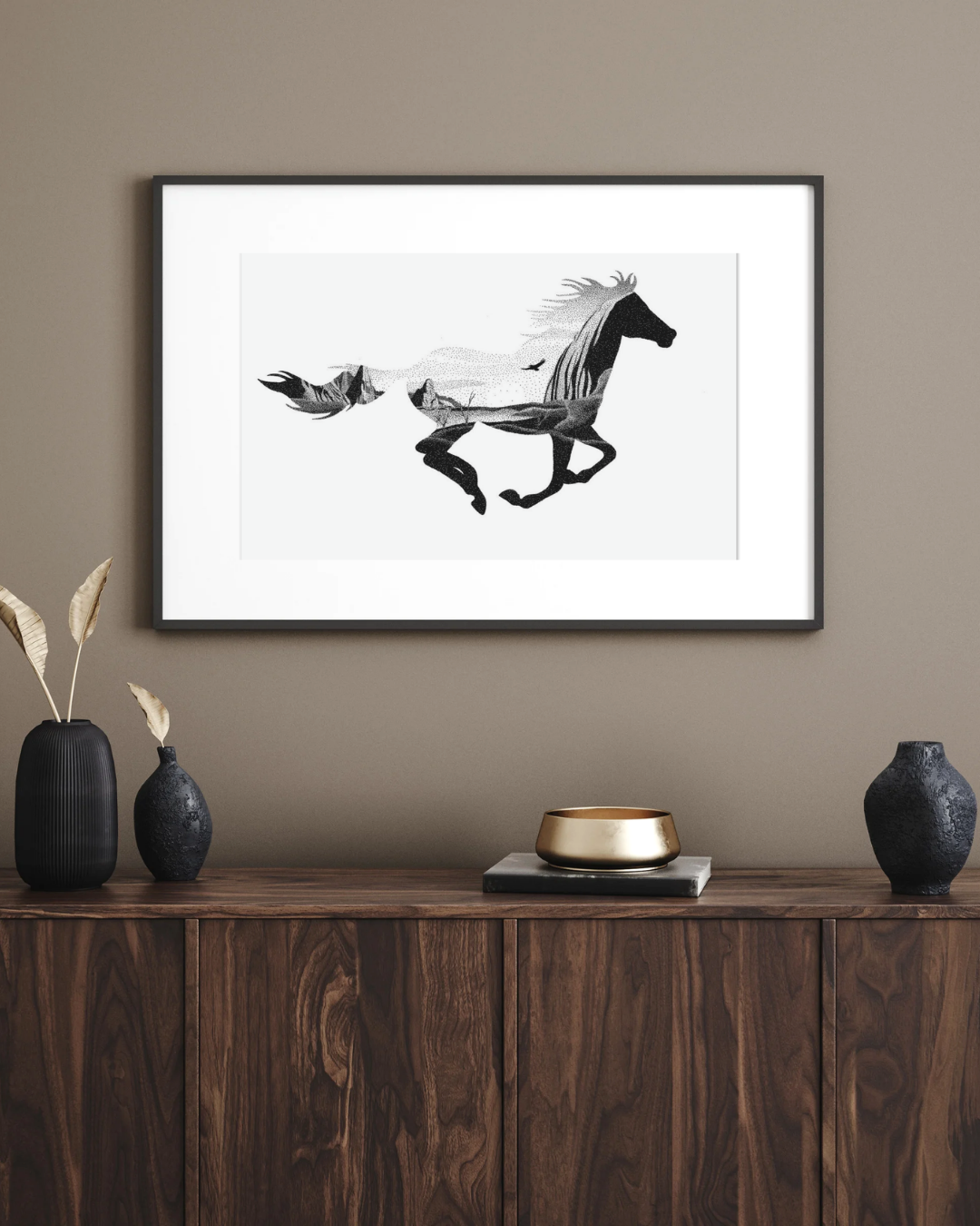 A horse silhouette with a desert landscape inside with an eagle, based on one of my favorite movies. Completed on December 30, 2021.
