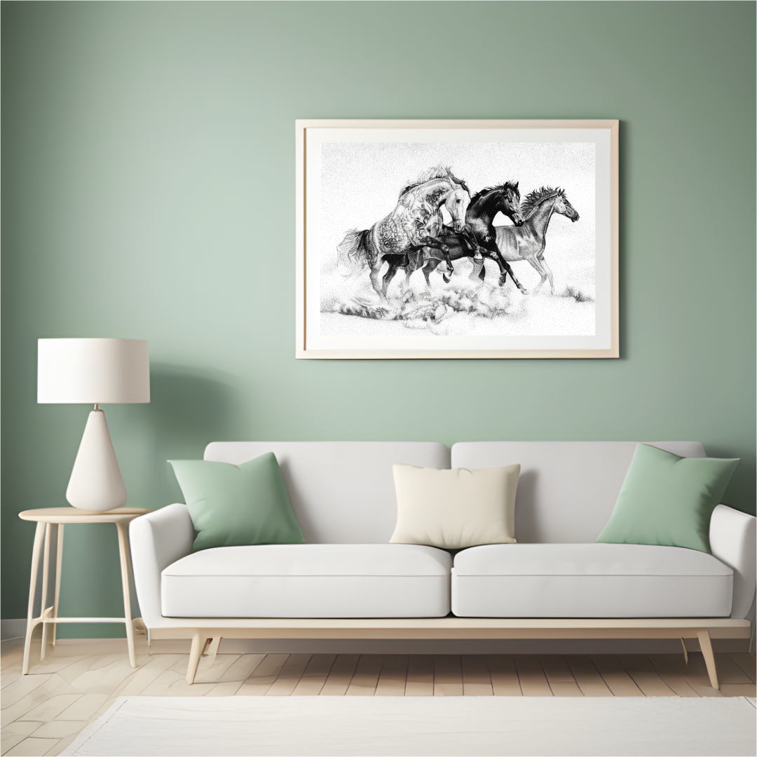 Dynamic drawing of three mustangs running, completed on July 24, 2023.