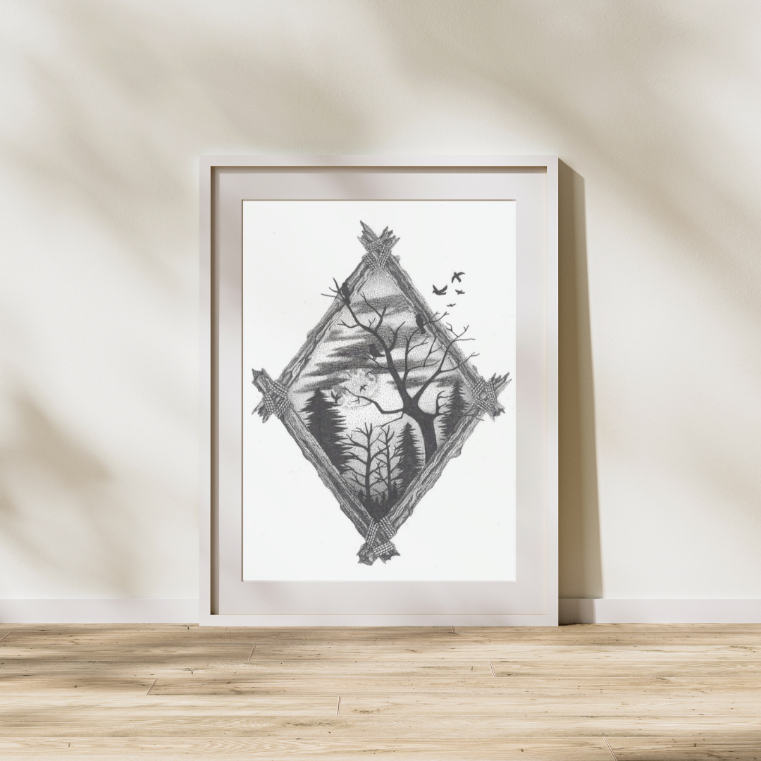 A forest design bordered with wooden sticks, completed on February 11, 2020.