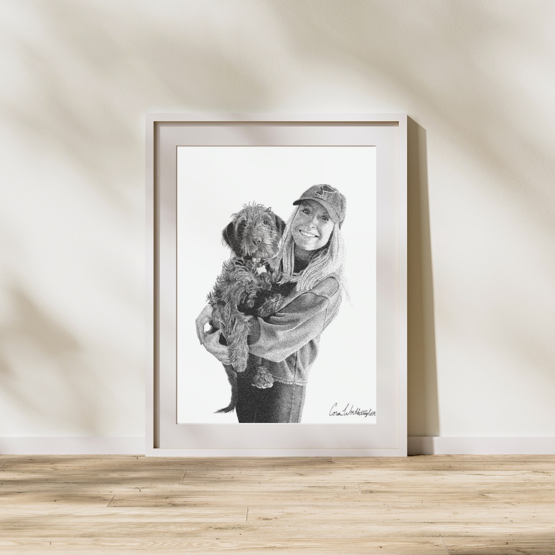 Sweet drawing of a young woman and her dog, completed on March 2, 2022.
