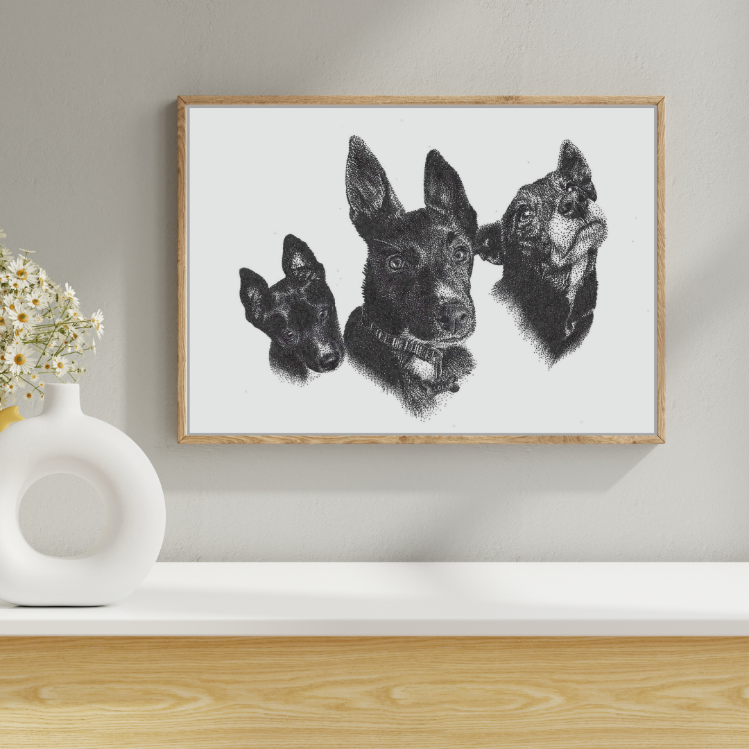 Drawing of one dog as a puppy, adult and senior, completed on April 10, 2025.