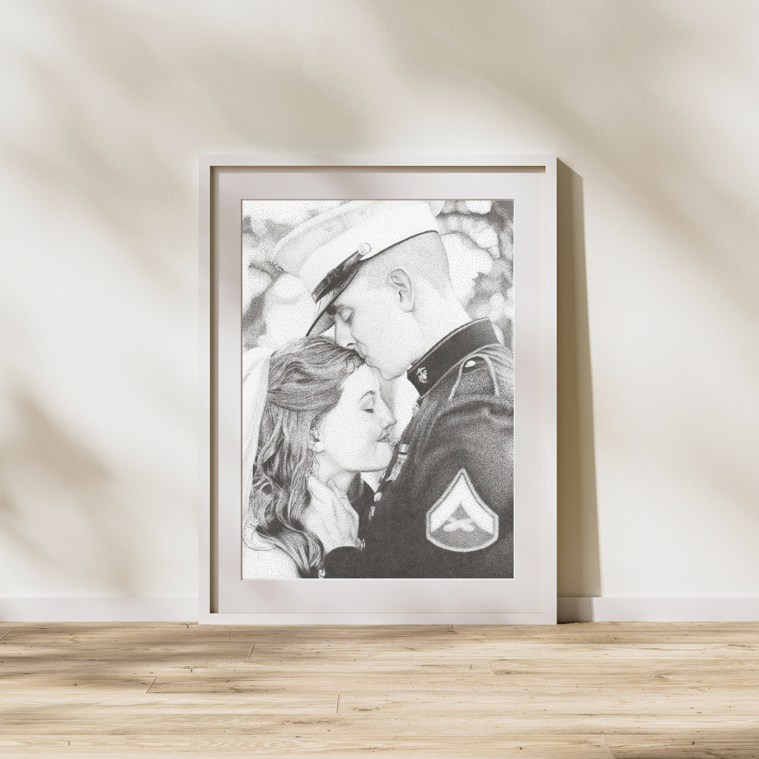 A Marine and his Wife for their anniversary with Jesus' hands holding a cross and wedding rings, completed on April 12, 2021.
